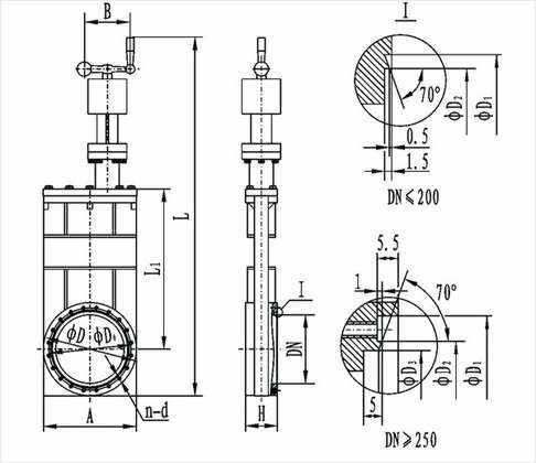 型号 | 通径(DN) | ΦD | ΦD0 | ΦD1 | ΦD2 | ΦD3 | H | A | n-d | L | L1 | B | 法兰标准 |